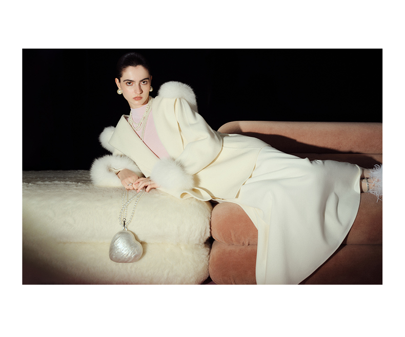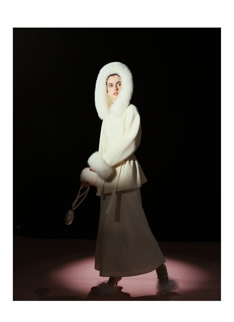 Ein Mantel wie geschaffen für das Licht des Mondes: gefertigt aus reinster Schurwolle, schwer, weich und kostbar, verleiht er seiner Trägerin eine Aura zeitloser Eleganz. Die abnehmbaren Silberfuchs-Besätze an Kragen und Ärmeln schimmern im Spiel des Lichts, ein Zeichen von Luxus, das Wärme und Noblesse vereint. Mit jedem Detail – vom fließenden Stoffgürtel bis zur klaren Silhouette – erzählt dieser Mantel von zurückhaltender Opulenz. In der Farbe Mondlicht-Weiß entfaltet er seine stille Kraft: erhellend, erhaben, ikonisch. Ob bei Tageslicht oder im Schein festlicher Abende, er kleidet nicht nur, er verwandelt. Ein Stück, das nicht einfach getragen wird – es wird inszeniert.