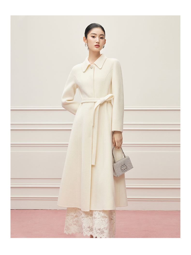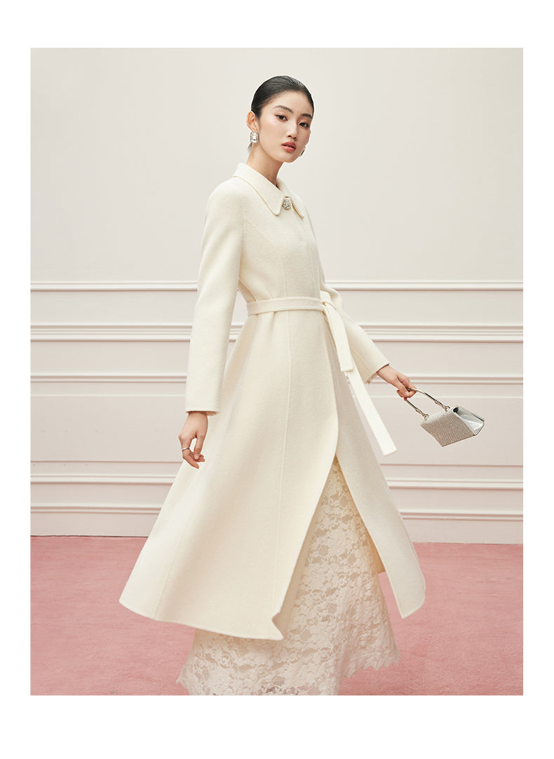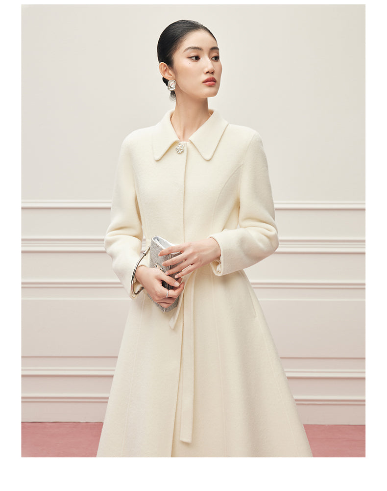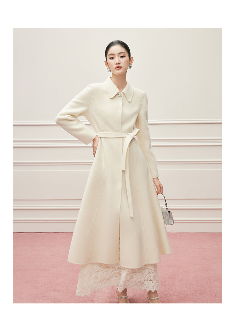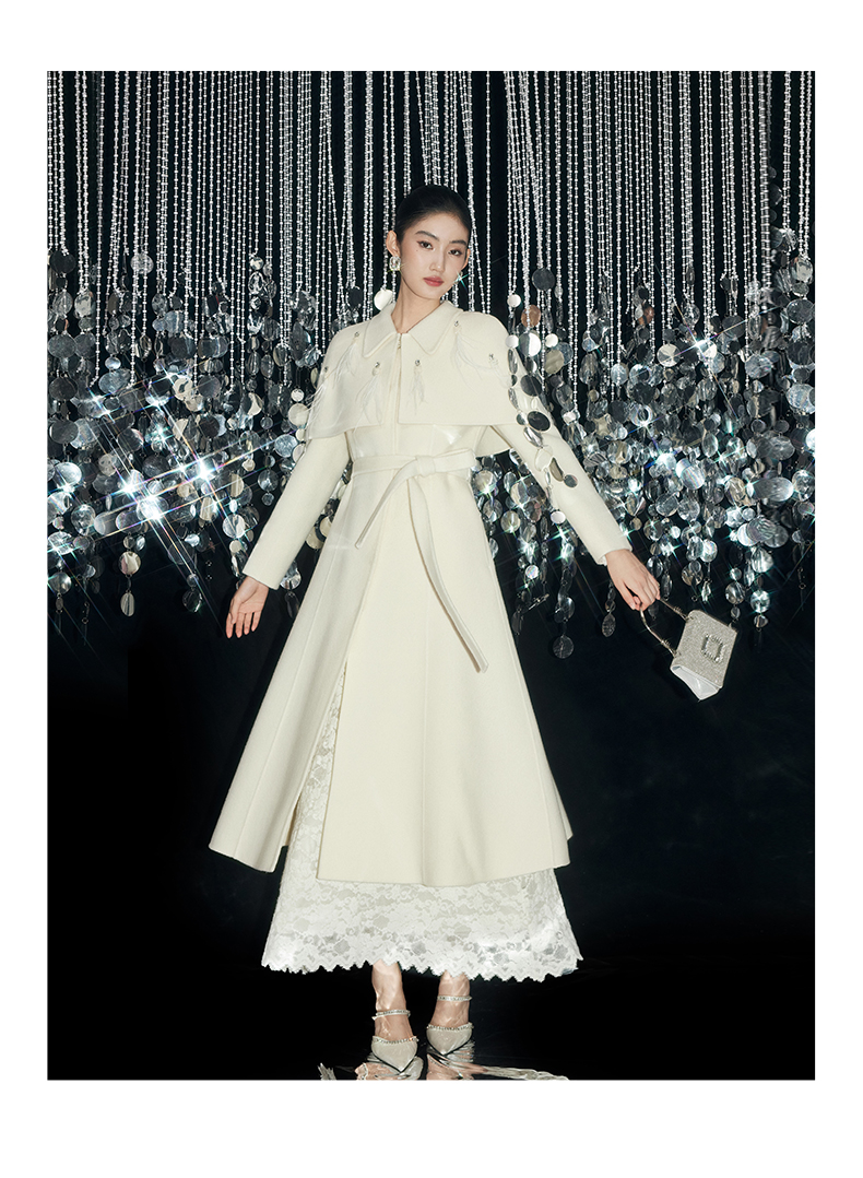 Ein Mantel wie ein Versprechen: aus reiner, seltener Virgin Wool gefertigt, umhüllt er die Silhouette mit der Leichtigkeit eines Mondstrahls und der Tiefe zeitloser Eleganz. Ein dezenter Kristallknopf am Kragen fängt das Licht ein wie ein Schmuckstück – ein stiller Hinweis auf die Liebe zum Detail. Der feine Bindegürtel legt sich sanft um die Hüfte und schenkt der Trägerin jene mühelose Anmut, die nur wahre Couture auszustrahlen vermag. Gefertigt aus 100% hochgezwirnter Kammgarn-Schurwolle, spürbar weich und zugleich schützend, ist dieser Mantel mehr als ein Kleidungsstück: er ist eine zweite Haut, ein Bekenntnis zu Beständigkeit und unvergleichlicher Schönheit. Sein Ton, Mondlicht-Weiß, erzählt von Reinheit und stiller Kraft – wie ein winterlicher Himmel, der zugleich Distanz und Nähe schenkt.