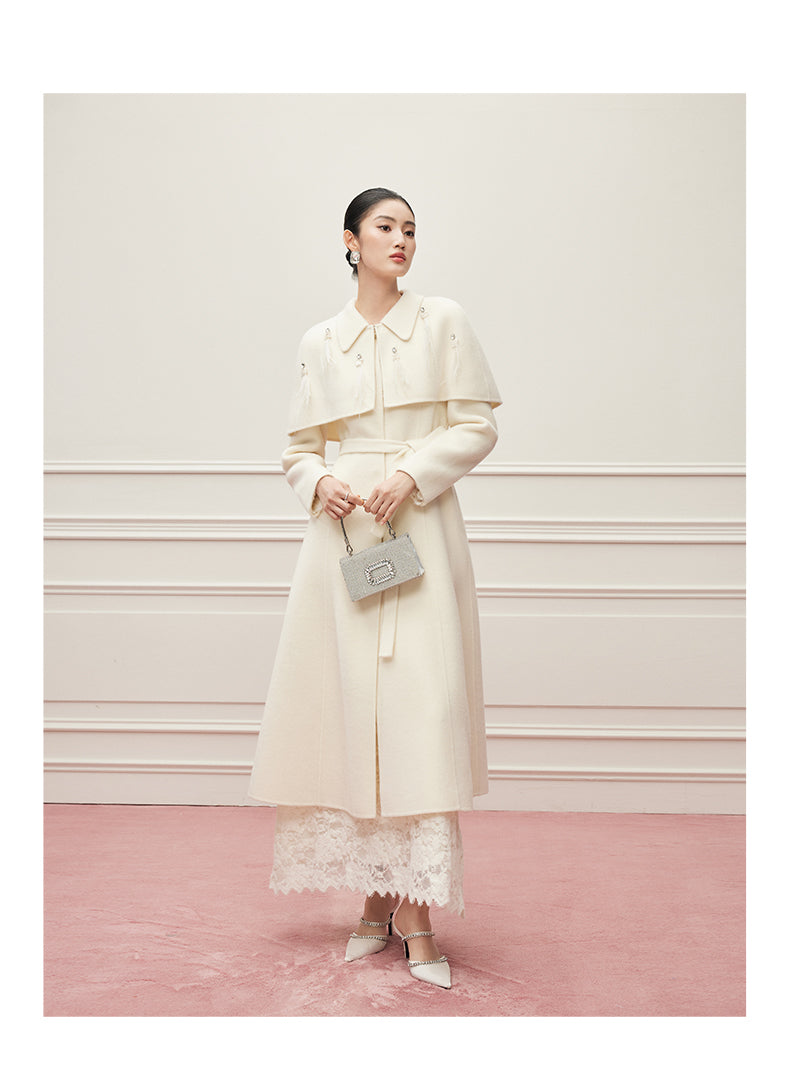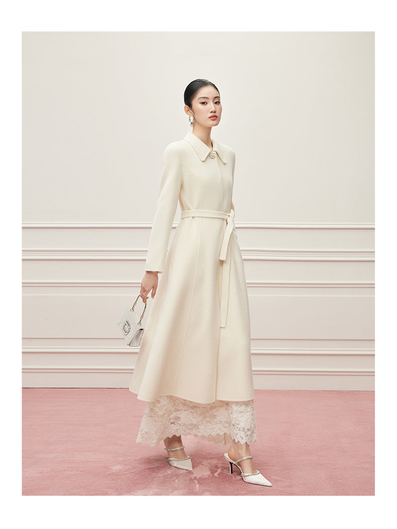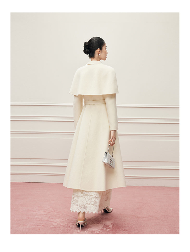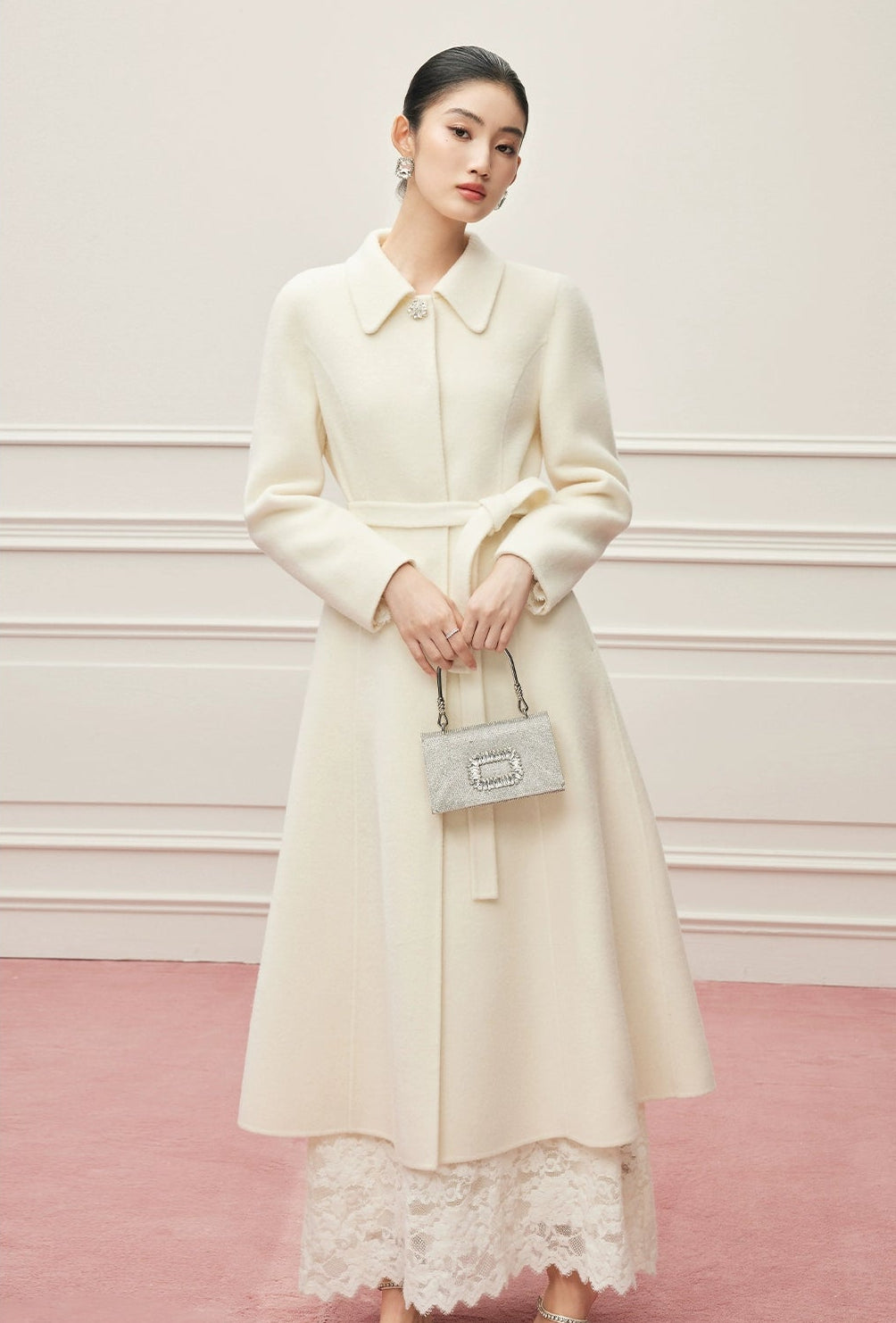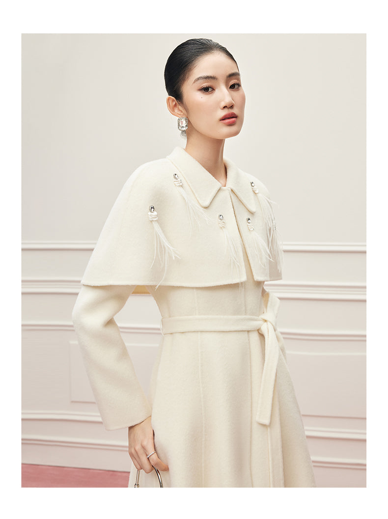 Ein Mantel wie ein Versprechen: aus reiner, seltener Virgin Wool gefertigt, umhüllt er die Silhouette mit der Leichtigkeit eines Mondstrahls und der Tiefe zeitloser Eleganz. Ein dezenter Kristallknopf am Kragen fängt das Licht ein wie ein Schmuckstück – ein stiller Hinweis auf die Liebe zum Detail. Der feine Bindegürtel legt sich sanft um die Hüfte und schenkt der Trägerin jene mühelose Anmut, die nur wahre Couture auszustrahlen vermag. Gefertigt aus 100% hochgezwirnter Kammgarn-Schurwolle, spürbar weich und zugleich schützend, ist dieser Mantel mehr als ein Kleidungsstück: er ist eine zweite Haut, ein Bekenntnis zu Beständigkeit und unvergleichlicher Schönheit. Sein Ton, Mondlicht-Weiß, erzählt von Reinheit und stiller Kraft – wie ein winterlicher Himmel, der zugleich Distanz und Nähe schenkt.
